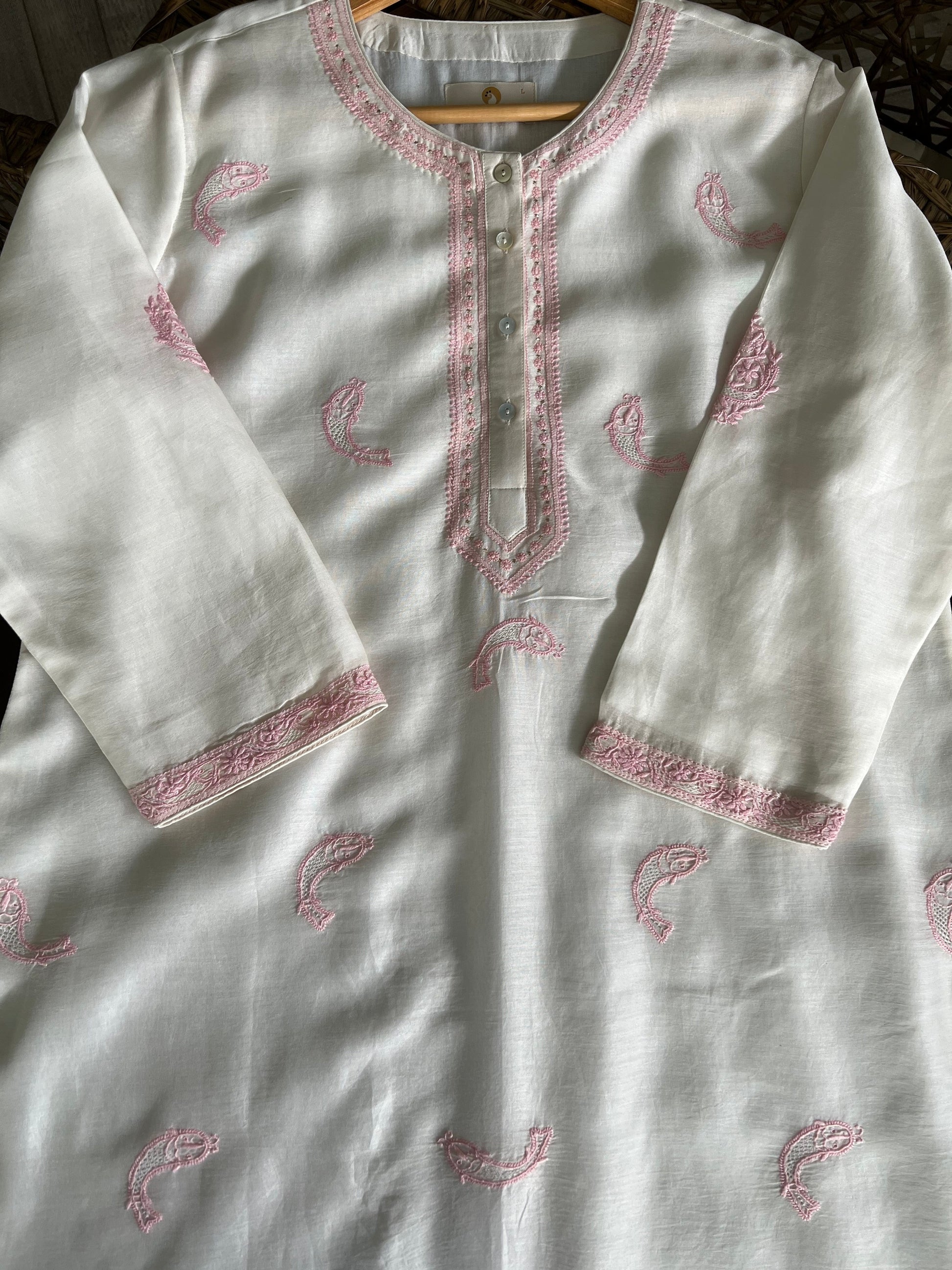 • Chikankari Fish bootis and neckline and sleeves border intricately displaying Phandas, Pattis, Keel, Hole, Pechni, Bakhiya, Kante and Jaalis.