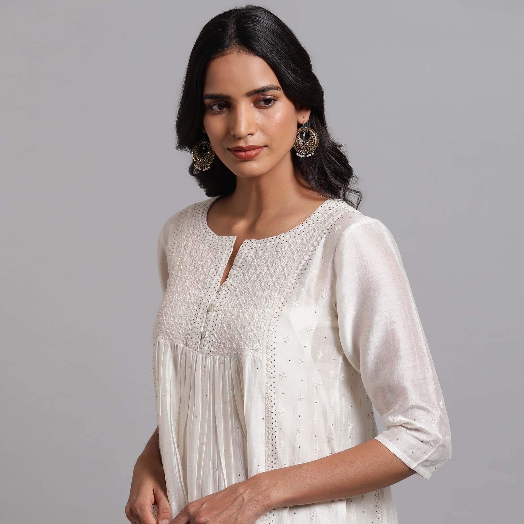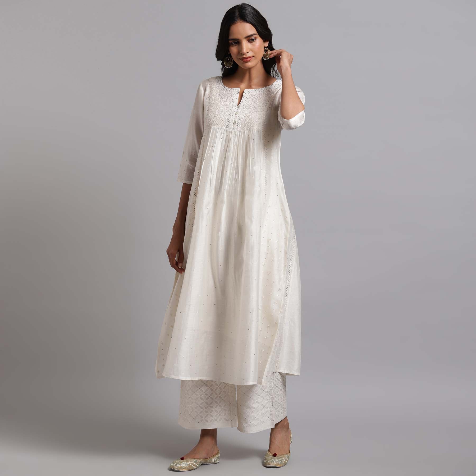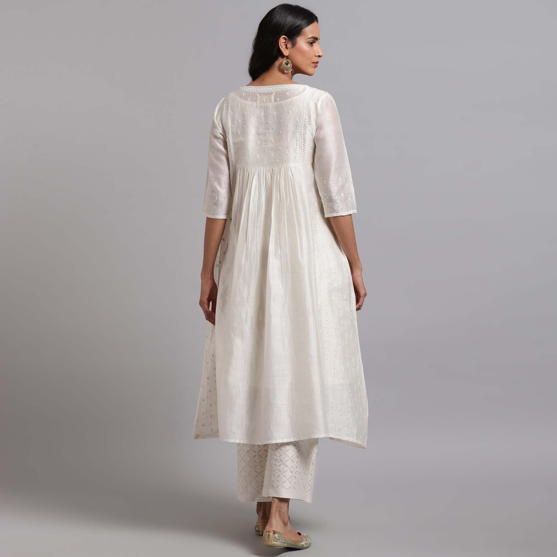 • This chikankari kalidar kurta with front gathers under the yoke area comprises of more than 600 keels and several mukaish dana.