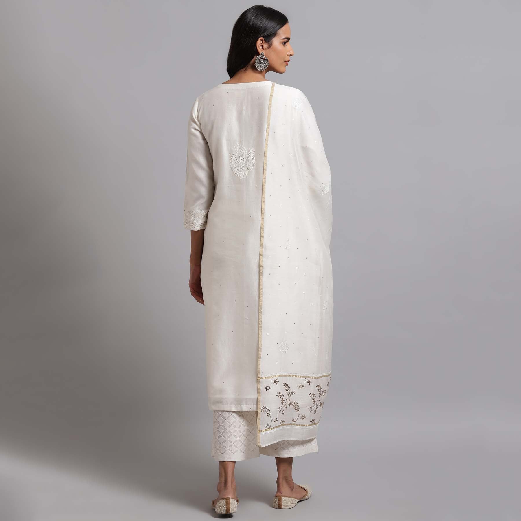 - Chikankari jaal kurta with mukaish highlights displaying Bakhiya, Patti, Phanda Keel and Jaali.