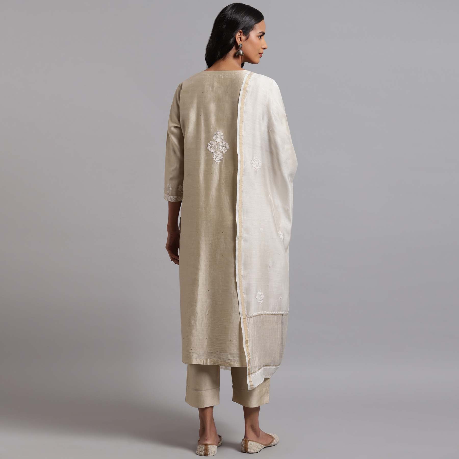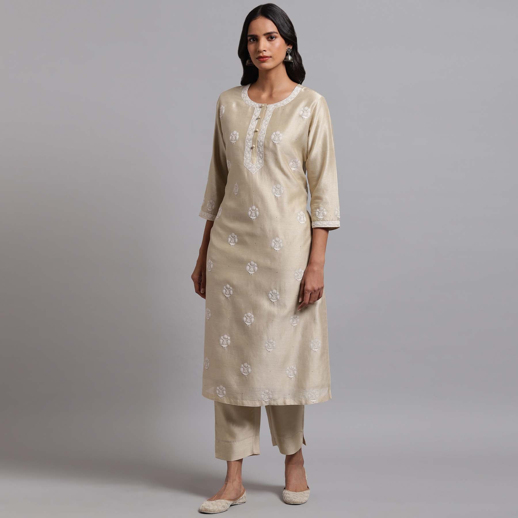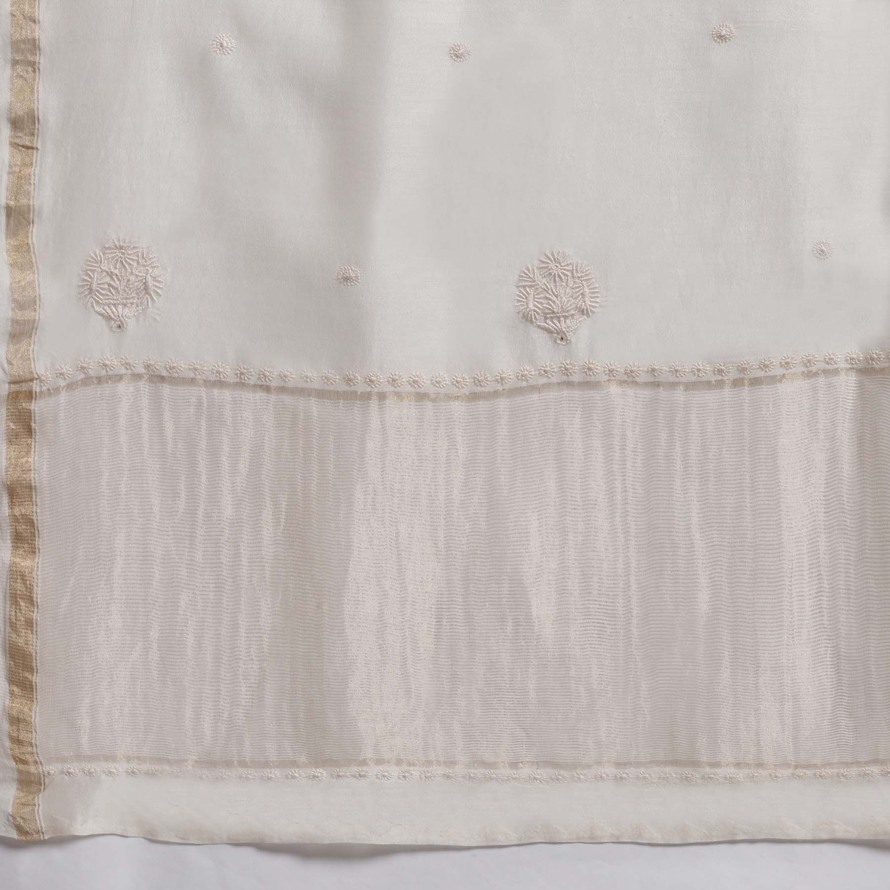 - Chikankari bootis and neckline intricately displaying the murri stitch.