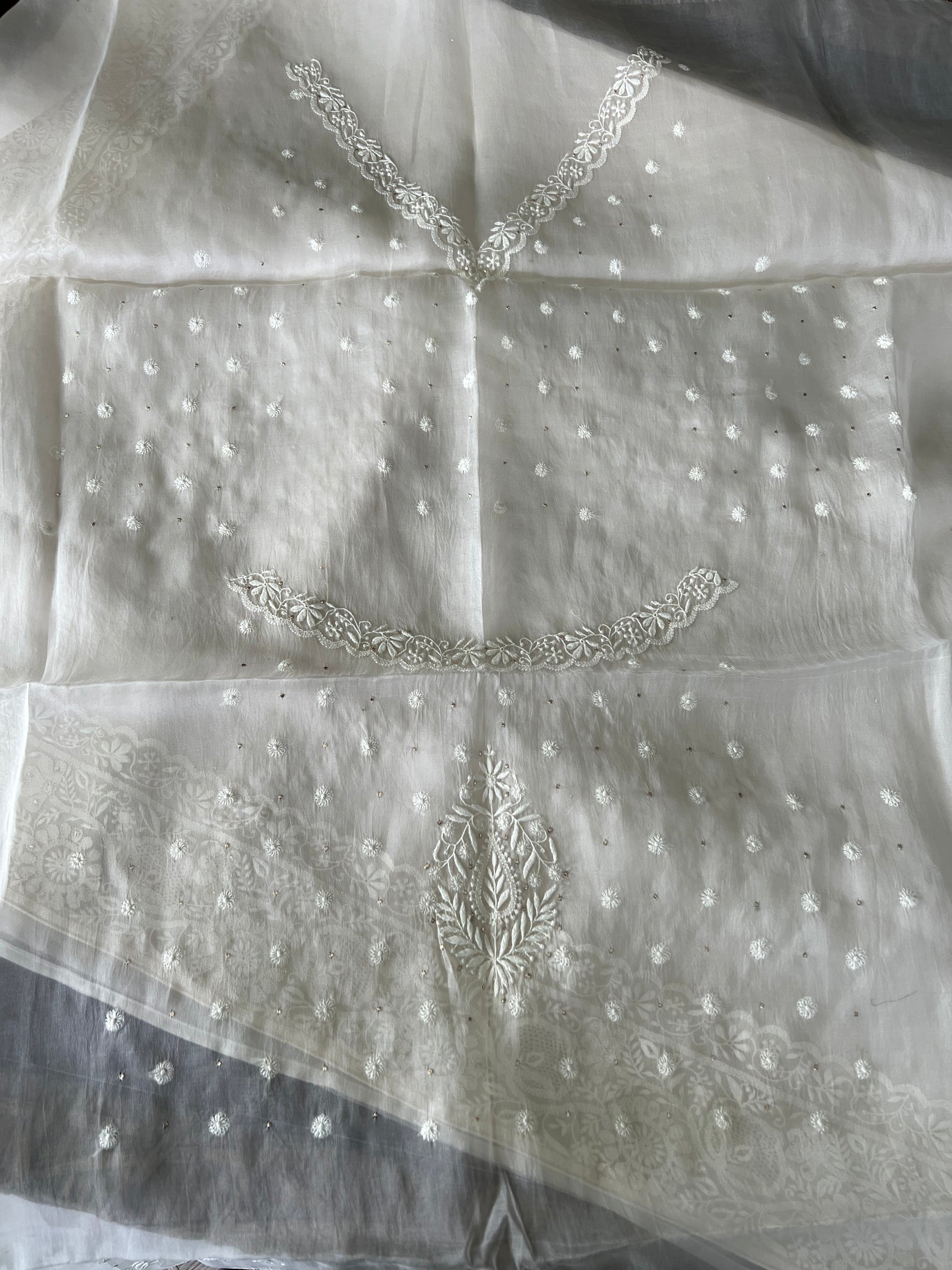 - Chikankari border saree displaying Jaali, Patti, Phanda, Bijli, kauri, bakhiya, pechni and hathkari.