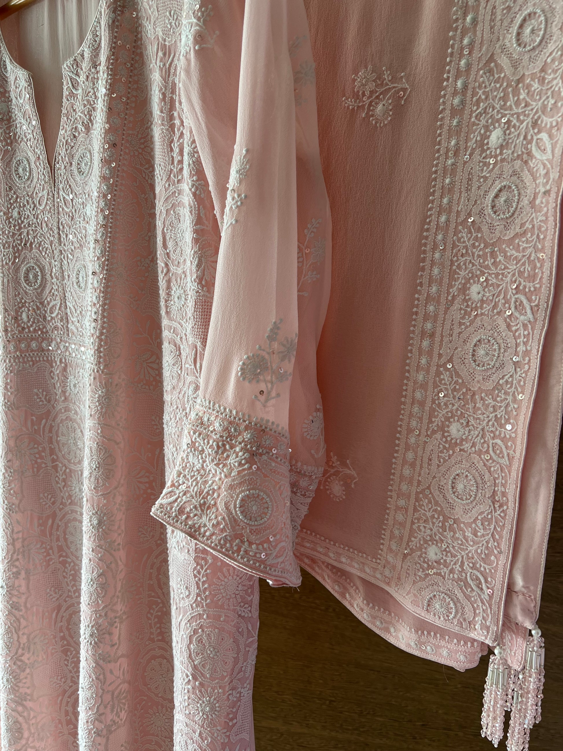 - A premium amalgamation of the various stitches in Chikankari in 2 Taar paired with a sober combination of sequins and pearl beads.
